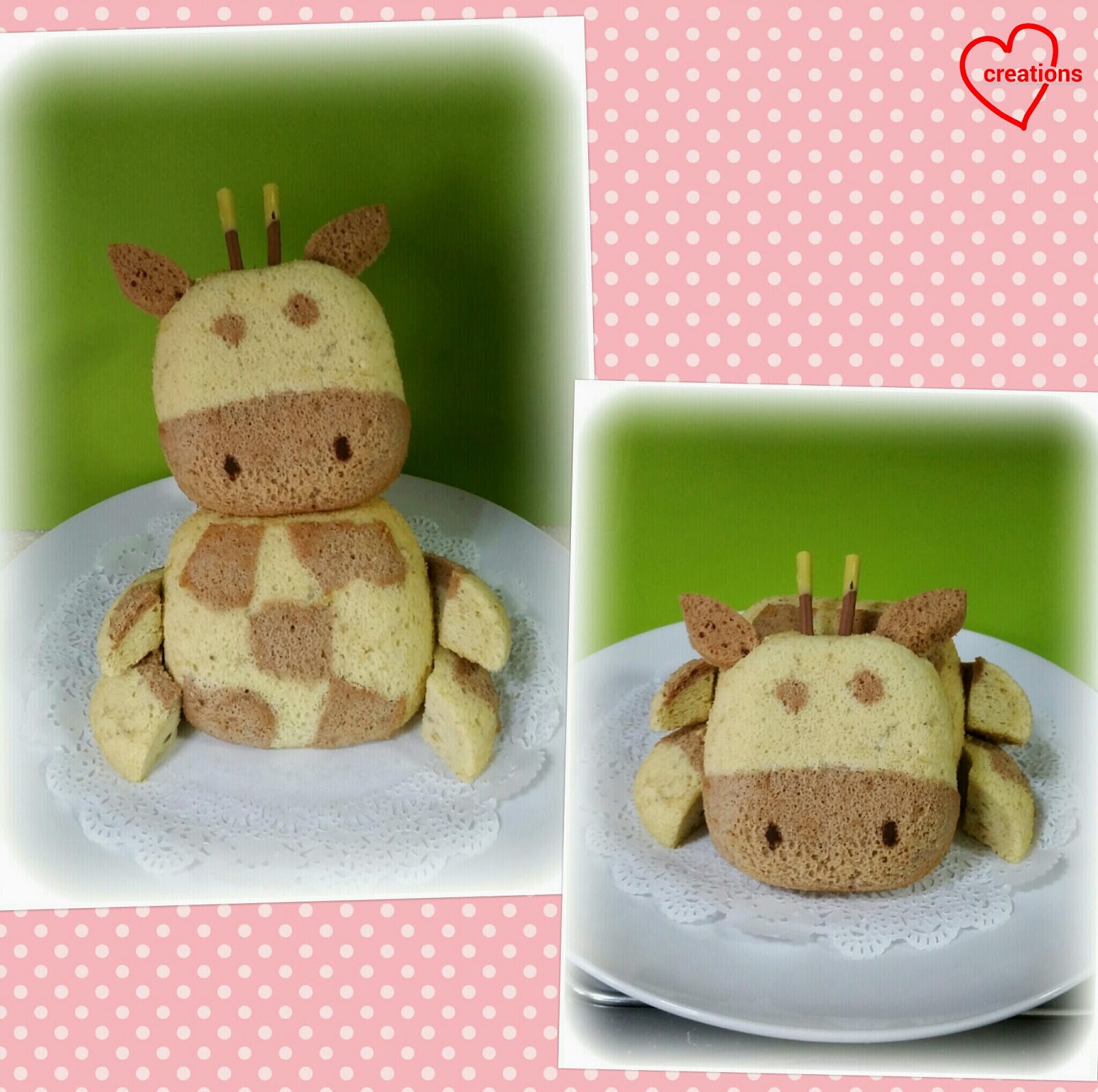 After this comes the fun part of preparing the different parts of the giraffes! I used a hearts cutter to cut out the ears from the chocolate chiffon cake. Cut out a heart and slice it into halves (top left pic in collage below). Make some cocoa paste by adding a spoonful of cocoa powder in a teaspoon of water (top right pic) and draw on the giraffe's nose using the cocoa paste with a fine brush (bottom left pic). Lastly, cut out the limbs from the round cakes, first by using a round cutter to cut a donut and then slicing the donut into halves (bottom right pic).